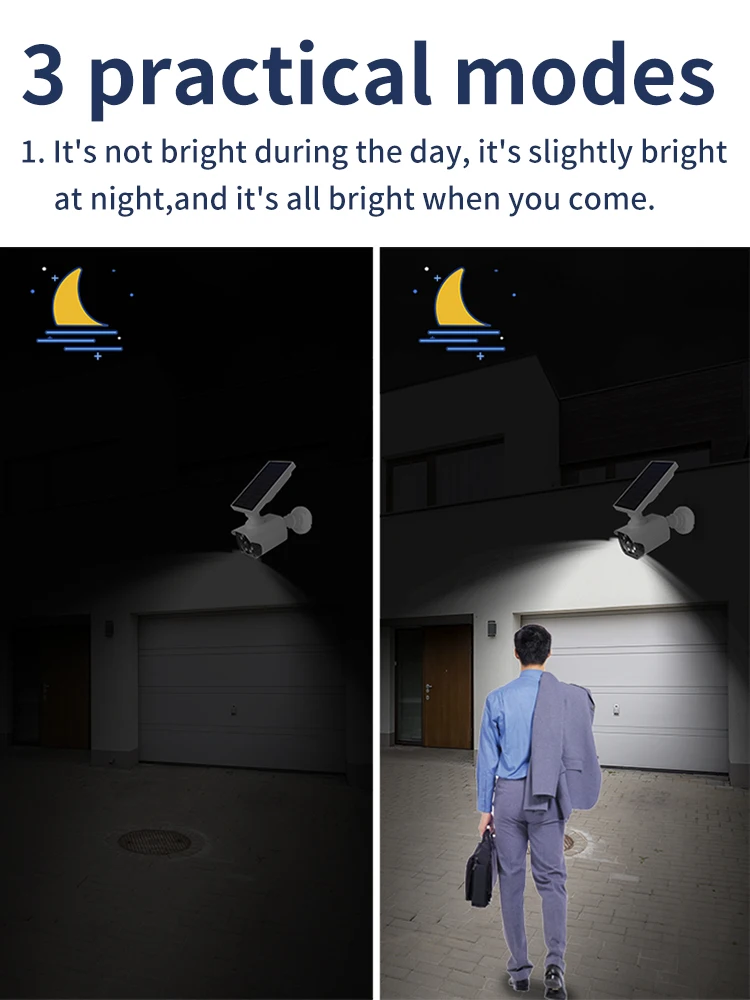 1.Press and hold for 3 seconds to turn on, for mode one: it's slightly bright at night, and it's all bright when you come.